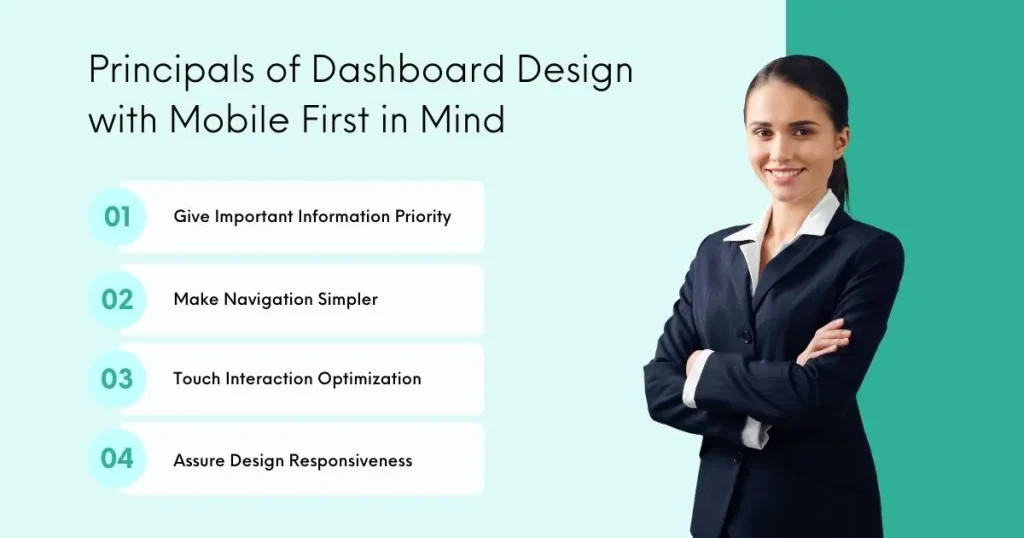 In the initial point Mobile devices for mobile-first dashboard design, it is important to make sure the dashboard is responsive to all screen sizes. If you visited on a laptop, tablet, or smartphone, the dashboard's responsive design ensures a regular user experience across all platforms. This flexibility is especially crucial for companies that work in settings where staff members use many devices.